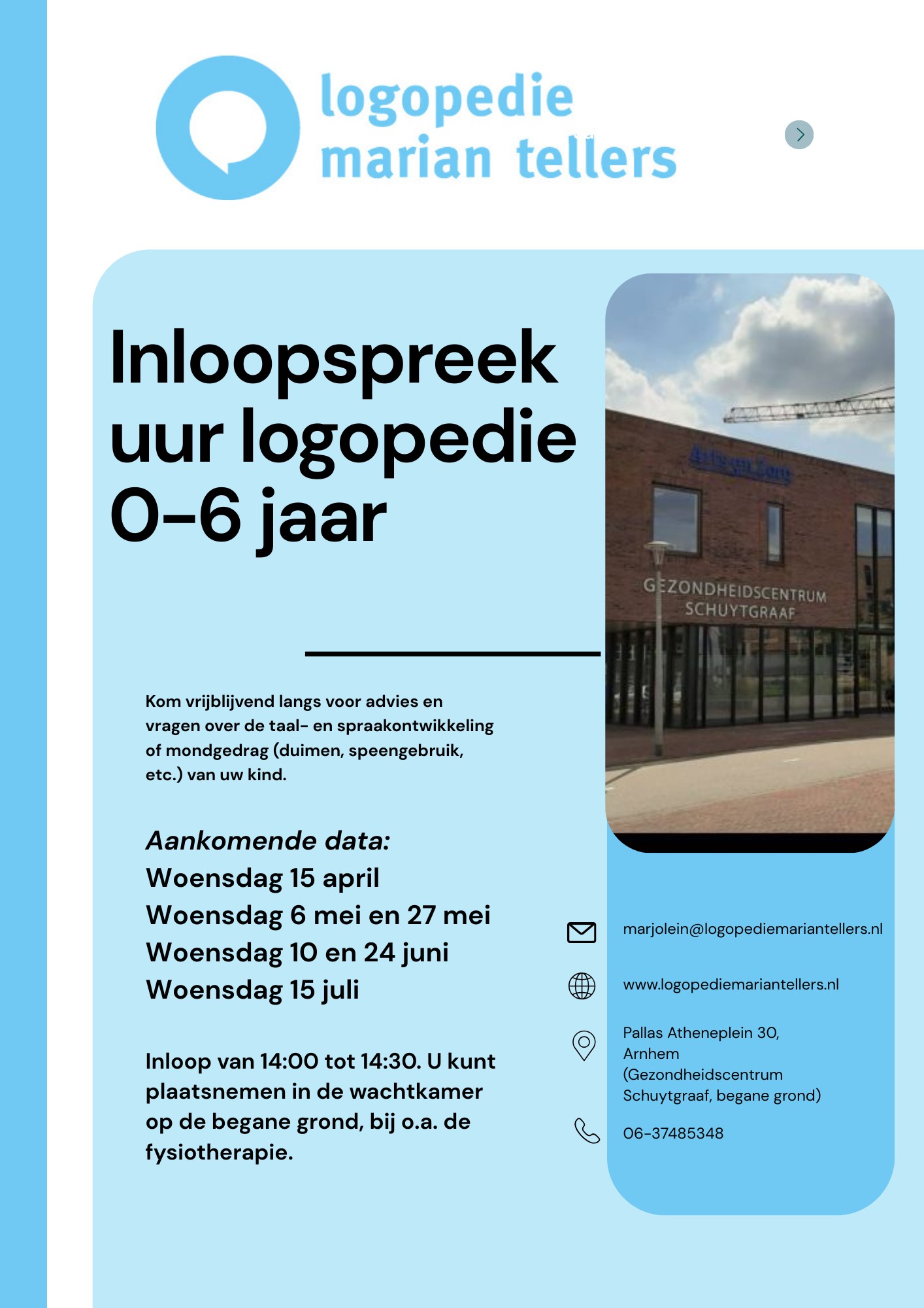 De inloop-spreekuren kinderlogopedie zijn er weer, ook in de praktijk in de Schuytgraaf te Arnhem.
