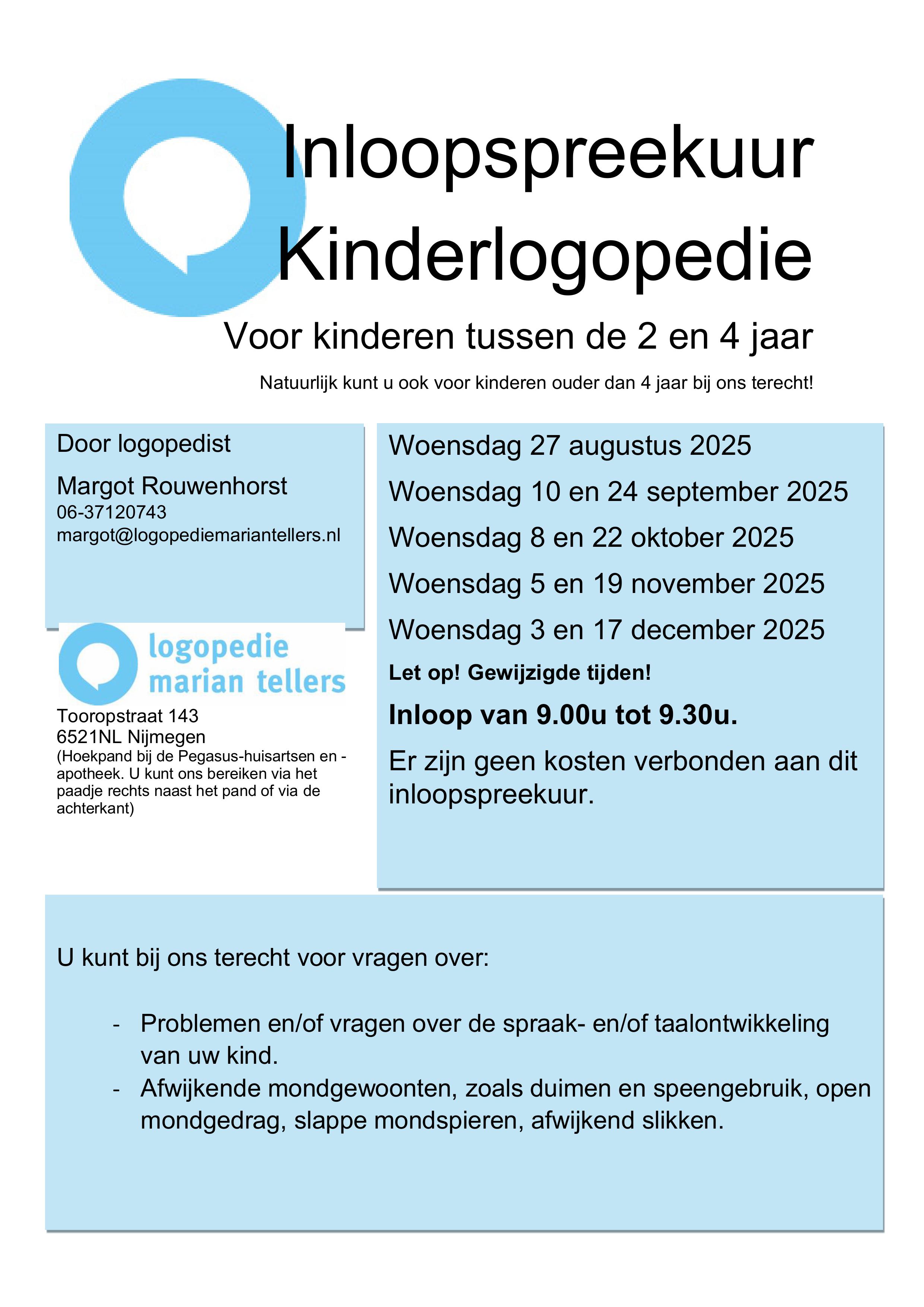 De inloop-spreekuren kinderlogopedie zijn er weer, ook in de praktijk op de Tooropstraat in Nijmegen-oost.